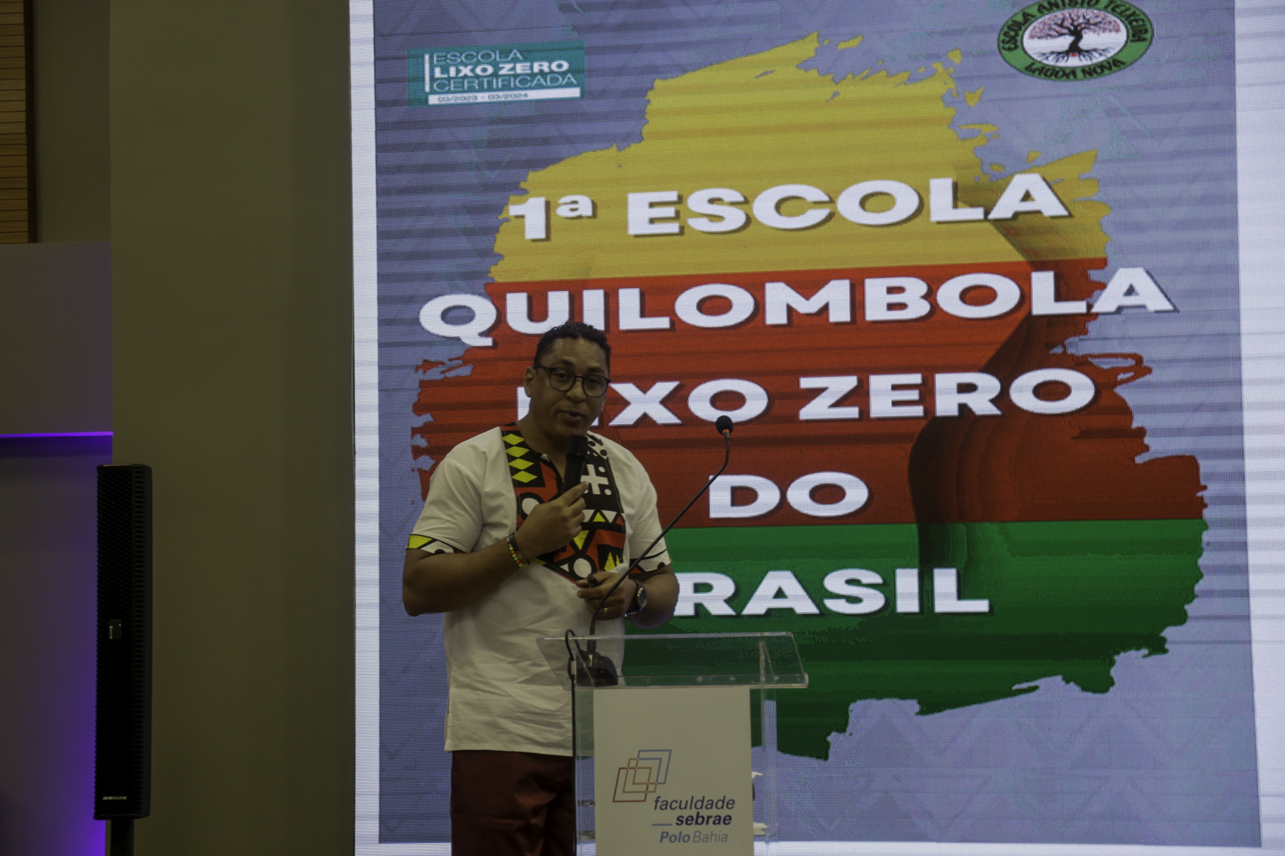Arnobson dos Santos Costa, diretor da Escola Municipal Quilombola Anísio Teixeira, localizada na comunidade de Lagoa Nova, em Irecê, apresentou o case que levou a instituição a ganhar o Prêmio LED (Luz na Educação) na categoria Empreendedores. A iniciativa mobilizou professores, coordenadores, equipe técnica, estudantes e famílias na criação de uma prática pedagógica transformadora que alia inovação, sustentabilidade, valorização cultural, educação antirracista e tecnologia social.