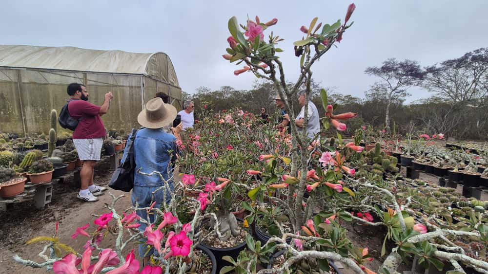 A primeira parada foi no Rancho Rosa do Deserto, onde o casal Julio Rodrigues e Damares Rodrigues compartilhou a história da propriedade dedicada à planta africana que se adaptou bem ao clima quente brasileiro. Em seguida, o grupo conheceu a charcutaria Sabor Latino, especializada em embutidos e defumados artesanais. Com 17 anos de atuação, o negócio reúne mais de quatro décadas de experiência do produtor Benedito Maciel Aguiar, que lidera a empresa ao lado dos filhos.