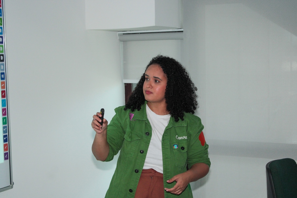 A palestrante conduziu a apresentação da oficina e mostrou como as funcionalidades da ferramenta Canva podem ajudar os participantes a produzir conteúdo direcionados às particularidades de cada negócio.
