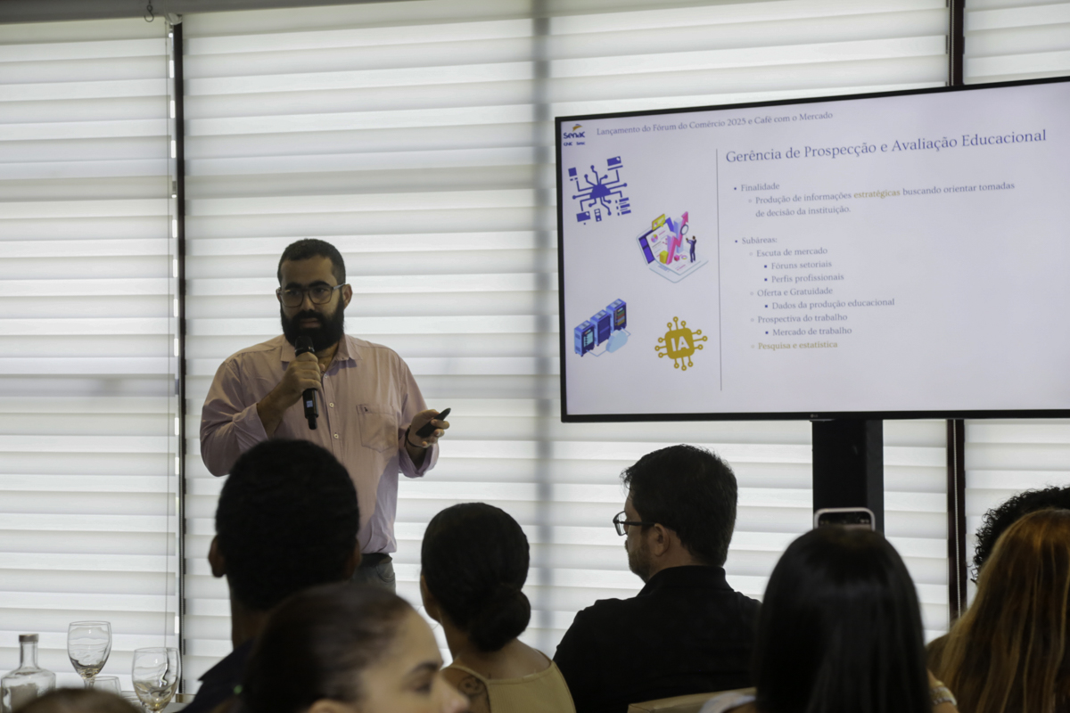 A programação desta quinta-feira foi encerrada com a palestra “A nova liderança é guiada por dados”, ministrada pelo especialista Iago Nascimento, que integra a gerência de Prospecção e Avaliação Educacional do Sistema Comércio.